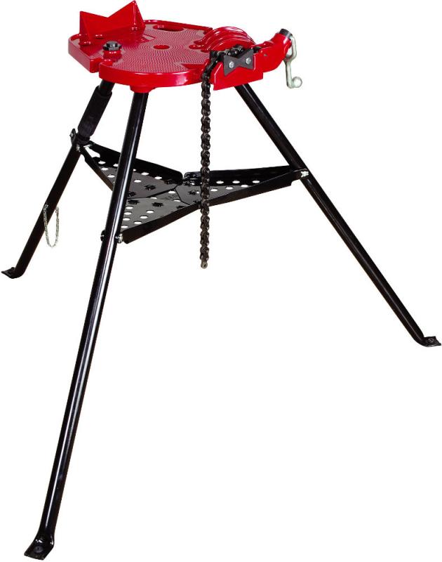 Reed tripod vises remain the sturdiest on the market. Tripods are manufactured with the heaviest gauge steel, overlapping hinges, and the best adjustable tray clamp, not a set screw, to keep the lower tray assembly and entire portable workbench tight – even after many hours of use! The heavy-duty design permits use with pipe up to 6 In. diameter. The exclusive double-faced jaws provide a second set of jaws. R470+ features a large top tray and a 45° cranking handle. Tripods fold into a compact shape, have a padded handle grip, and boast the lightest weight for the easiest portability of all well-known tripods.