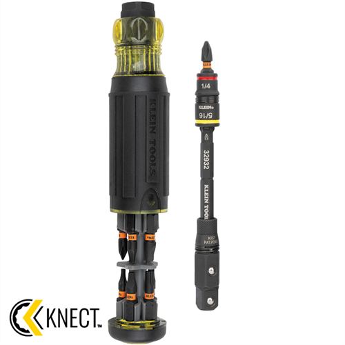 - KNECT™(S) 1/2-Inch collet, 11 screwdriver bits, 1 flip socket and 3/8-Inch square drive adapter