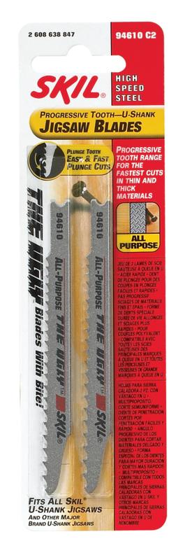 Blade Cutting Material: High Speed SteelBlade Length (in): 3.75Blade Thickness (in): 0.05Jig Saw Blade Type: Jig Saw U-ShankMaterial Cut: Multi-PurposeTooth Count: 15Package Contents: 2 BladesProgressive Blade Tooth Spacing: YesSaw Blade Type: Jig SawSet / Individual: SetTeeth Per Inch: 5-10 Teeth Per InchTool Weight (lbs): 0.03