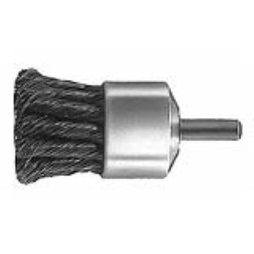A Knotted End Brush is better equipped than a Crimped End Brush for heavy burr and scale removal, cleaning rust, castings, paint build up around studs and bolts. The twisted strands of wire form a sturdy surface to work against the material being removed. This Knotted End Brush has a face diameter of 1-1/8 inch to cover larger surfaces and is made of .014 carbon steel wire.