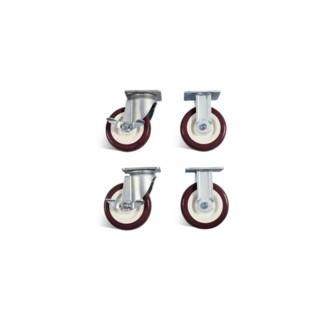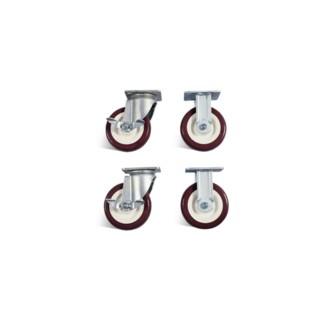 The Model 516 set of four 6 in casters with brakes fits all Knaack jobsite storage models. The 2 in non-marking Polyurethane wheels support 2,240 lbs per set. The set includes two rigid and two swivel wheels.