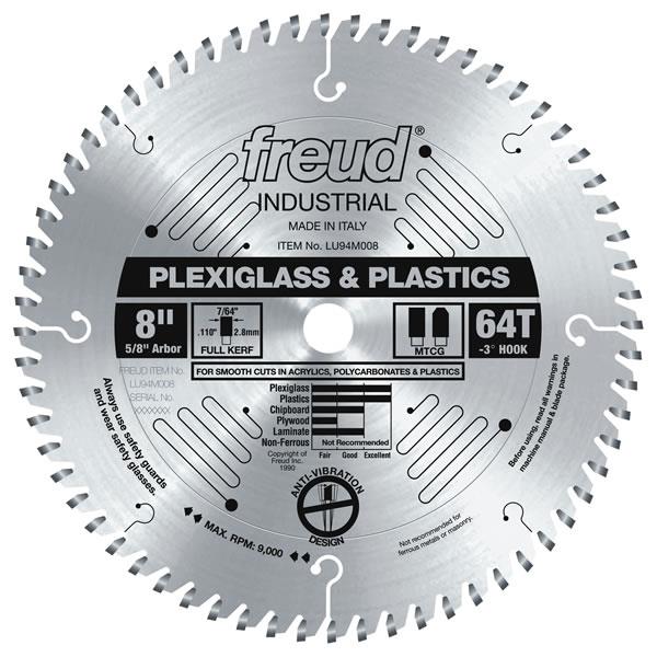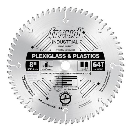 This industrial blade cuts acrylics, polycarbonates and other plastics, leaving a smooth finish without melting. By combining micrograin carbide tips with a specially modified triple chip grind these blades will give a clean smooth cut. These blades produce less heat keeping the cut edge crisp.