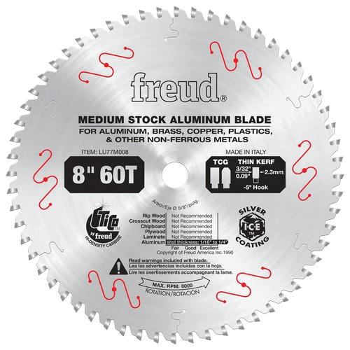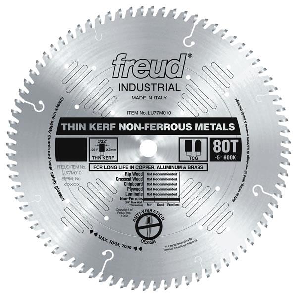 This thin kerf heavy-duty, non-ferrous metal cutting blade produces an excellent finish. These blades have custom designed gullets to minimize chip build-up and specially formulated carbide for long life. Freud recommends use of a liquid lubricant when cutting. This can be accomplished with a spray of WD-40 or other lubricant every 4 to 5 cuts. Wax sticks are not recommended.