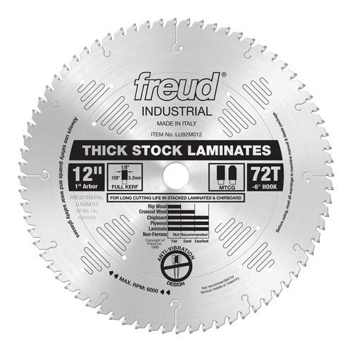 This heavy-duty production blade produces an excellent finish on the top and bottom of thick laminates and melamine. The LU92M series is ideal for cutting stacked 3/4" laminates and melamine. Each tooth has a special modified triple chip grind design created by computer simulation to breeze through thick stock and single or double-sided laminates, leaving a chip-free edge.
