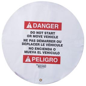 The Master Lock No. 4724 Steering Wheel Cover provides visual deterrence during vehicle maintenance. The 24in (61cm) cover can be locked in place with a 421 hasp and safety padlock. For added security, use the S806 adjustable locking cable around steering wheel and foot pedals. Trilingual warning (English, French and Spanish) notifies employees not to start or move vehicle.