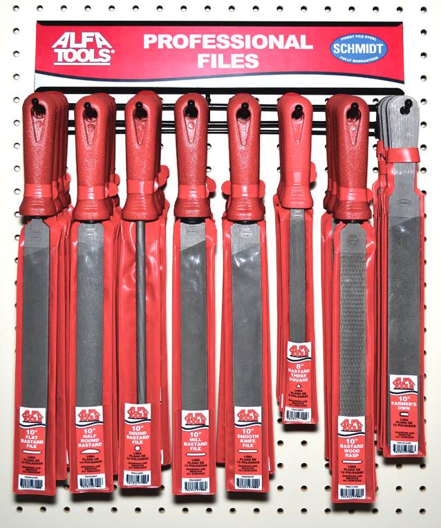 32 Piece Merchandiser, Assortment of Pouched Files with Handles, 10" Bastard Flat, 10" Bastard Half Round, 10" Bastard Mill, 10" Bastard Mill, 10" Smooth Knife, 8" Bastard Three Square, 10" Bastard Wood Rasp, 10" Farmers own Handy File