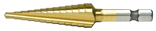 ProBit⢠Monolock⢠Multi-Step Bit, Cone Drill, CN, Style "AH", 13 Steps, 1/8" to 1/2" x 32nds, 2 Flutes, High Speed Steel, Titanium Nitride Coated, 1/4" Hex Power Shank, 3" Overall Length, 1 per Tube