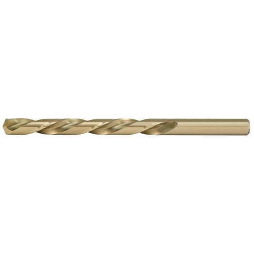 Alfa USA Jobber Length Cobalt Fractional Drill Bit, 1/2" Diameter, 0.5000 Decimal Equivalent, 4-1/2" Flute Length, 6" Overall Length, High Speed Steel, Straw Gold Finish, 135° Split Point, NAS 907, Type J, Straight Shank, Heavy Duty, Left Hand Spiral, Made in USA, 6 per Envelope