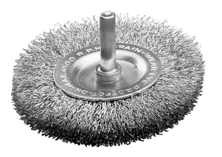 Crimped WIRE WHEELS, 3" Brush Diameter x 1/4" Shank, Coarse Wire, 0.012" Wire Diameter, 6000 Maximum RPM, 1 per hang-up Clamshell
