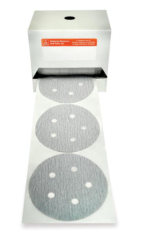 National Abrasives, 5" x No Hole x 120 Grit Silicon Carbide White Sanding Discs with Tabs, PSA, Pressure Sensitive Adhesive, "B" Weight Resin Bond Paper, Stearated, No Hole, Link Roll, 100 Discs per Roll