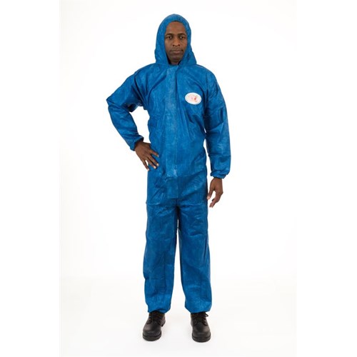 Disposable coveralls with fabric that has been tested for protection against blood, blood-borne pathogens and many other liquid hazards. Strong, fabric that has excellent abrasion resistance and resists tears. Helps to keep the wearer cool and avoid heat stress through enhanced moisture vapor transmission. Attached hood with elastic wrists & ankles for snug, secure fit. Zipper front with sealable storm flap provides an additional layer of protection. Blue color makes stains and splashes on fabric less conspicuous. Recommended applications include emergency response, category 3 black water, tank cleaning, crime scene remediation and animal research.