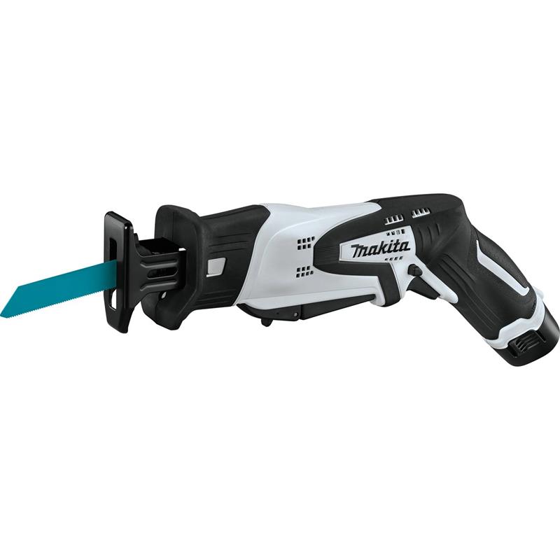 The 12V max Lithium-Ion Cordless Recipro Saw (RJ01W) is the perfect solution for fast cutting and trimming. The RJ01W combines pro power and pro speed with ease-of-use in a compact size that weighs only 2.6 lbs. (with battery). The dual-position trigger allows for either paddle switch or trigger switch operation for increased versatility.