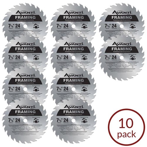 Freud 7-1/4" x 24 Tooth Avanti Blade 10 pack (A0724A) cuts softwood, pressure treated materials, wood beams and OSB. Ideal for framing projects, it features carbide tips and is durably constructed.