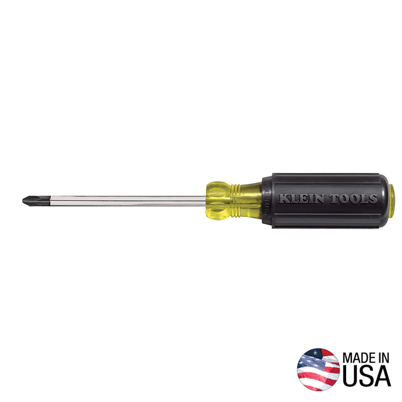 Cushion-Grip™ handle allows for greater torque and comfort. Integral flanges inside handle provide solid, twist resistant blade anchor. Special heat treated shafts. Precision machined tip for exact fit. Premium chrome plated for smooth feel and corrosion resistance. Patented Tip Ident quickly identifies the type of screwdriver and screwdriver tip orientation. Meets or exceeds applicable ASME / ANSI specifications. No. 2 Phillips with 4-Inch shank.