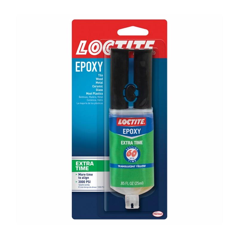 Loctite Epoxy Extra Time is a two-part system consisting of an epoxy resin and a hardener available in a convenient dual syringe. When mixed in equal volumes, resin and hardener react to produce a tough, rigid, high strength bond. Loctite Epoxy Extra Time sets in 60 minutes, excellent for complex multi-piece assemblies. It is used as an adhesive for a wide range of materials or as a versatile filler for gap bonding, surface repairs and laminating. Loctite Epoxy Extra Time does not shrink and is resistant to water and most common solvents. It can be tinted with earth pigments, cement or sand for color matching. It can be sanded and drilled.